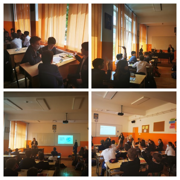 Am continuat cu o oră de educație ecologică, însă rolul de profesori a fost preluat de elevi. Irina și Ana (clasa a X-a E) le-au vorbit colegilor de gimnaziu (clasa a VI-a) despre amprenta noastră de carbon și cum activitățile zilnice pot avea un impact negativ asupra mediului înconjurător. Jocuri, discuții libere, activități în echipe și, desigur, temă pentru acasă: găsirea unor soluții pentru a reduce amprenta de carbon pe care fiecare dintre noi le poate aplica, grupurile de lucru fiind coordonate de d-na profesor Anastasia Pașca.