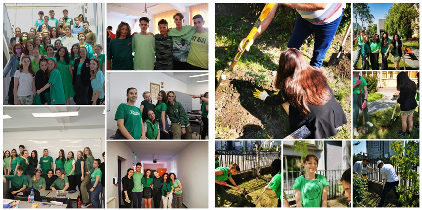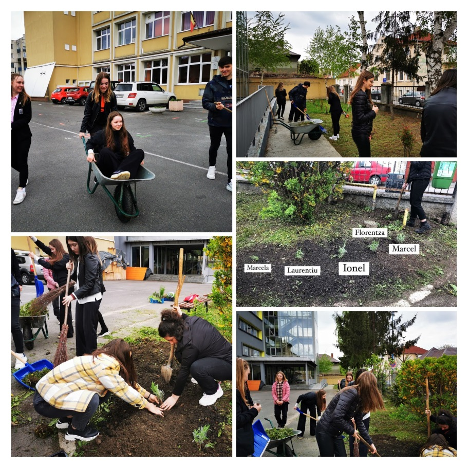 - Pentru a întări bariera verde care ne protejează într-o zonă intens circulată, bobocii din clasa a IX-a A au plantat arțari și trandafiri donați de o pepinieră locală Uniforma obișnuită a primit o pată de culoare prin adăugarea unui element vestimentar sau accesoriu verde, aceasta fiind culoarea zilei pentru toți elevii, dar și pentru profesori.